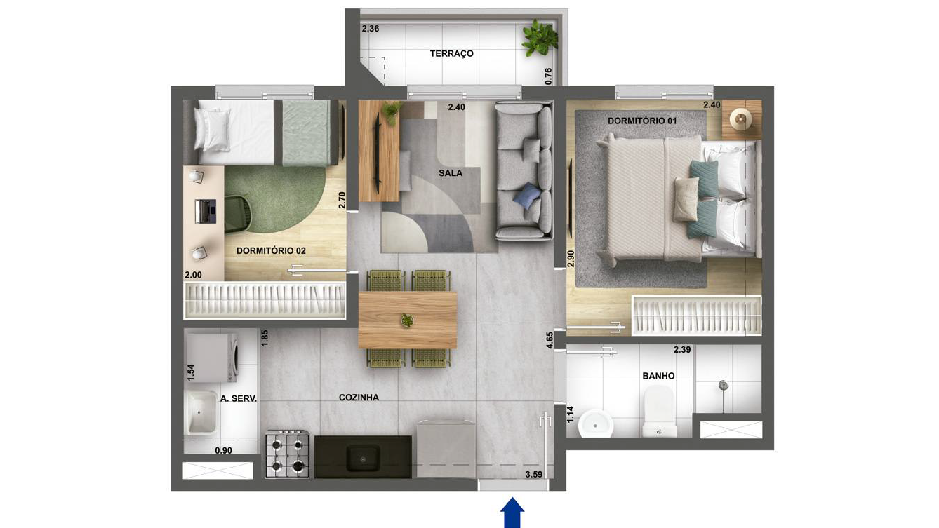 45m², 2 dormitórios (sendo 1 suíte) com terraço.