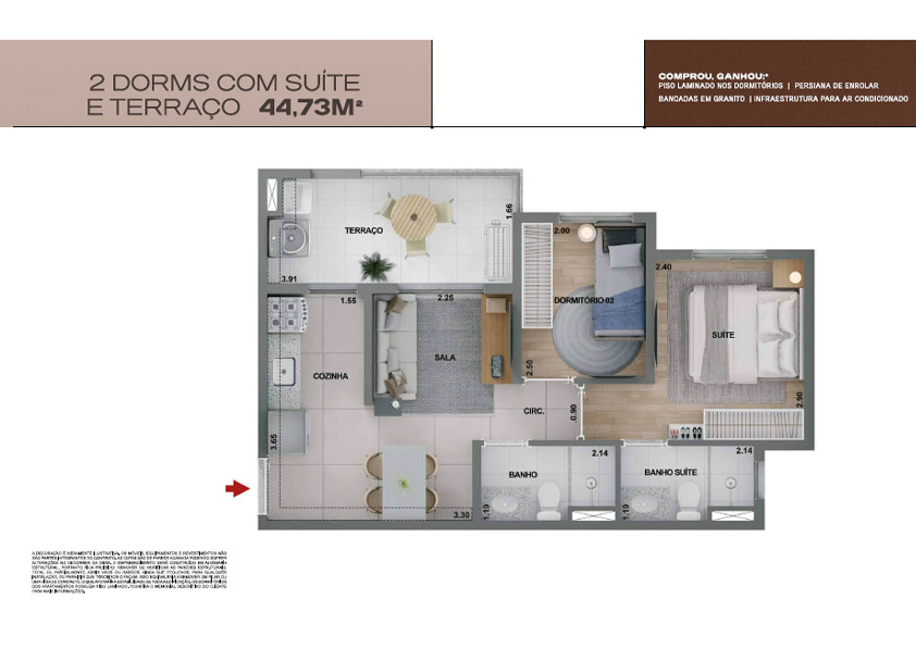 - 2 Dormitórios com Suíte (45m²): A planta mais completa, com suíte e terraço, ideal para máximo conforto.