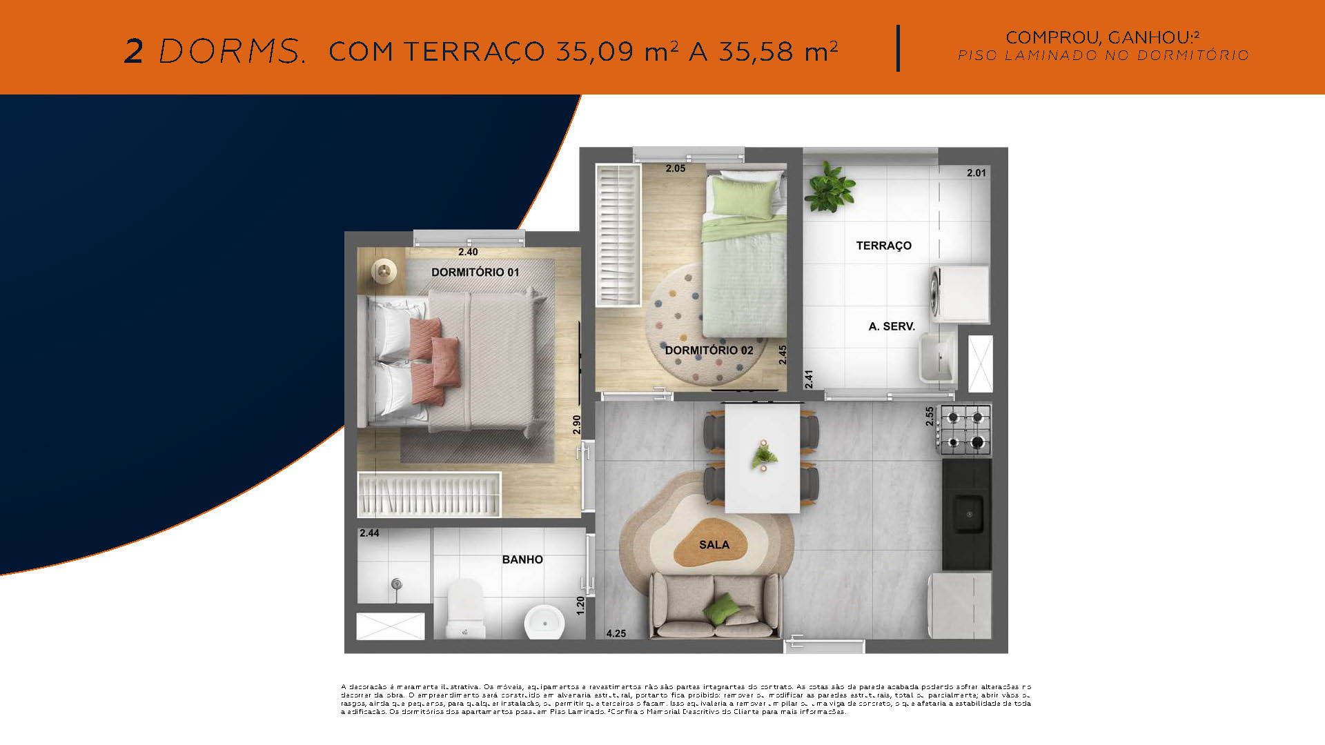 - 2 Dormitórios (33m², 35m² e 38m²): Plantas versáteis, incluindo unidades de 38m² com terraço.