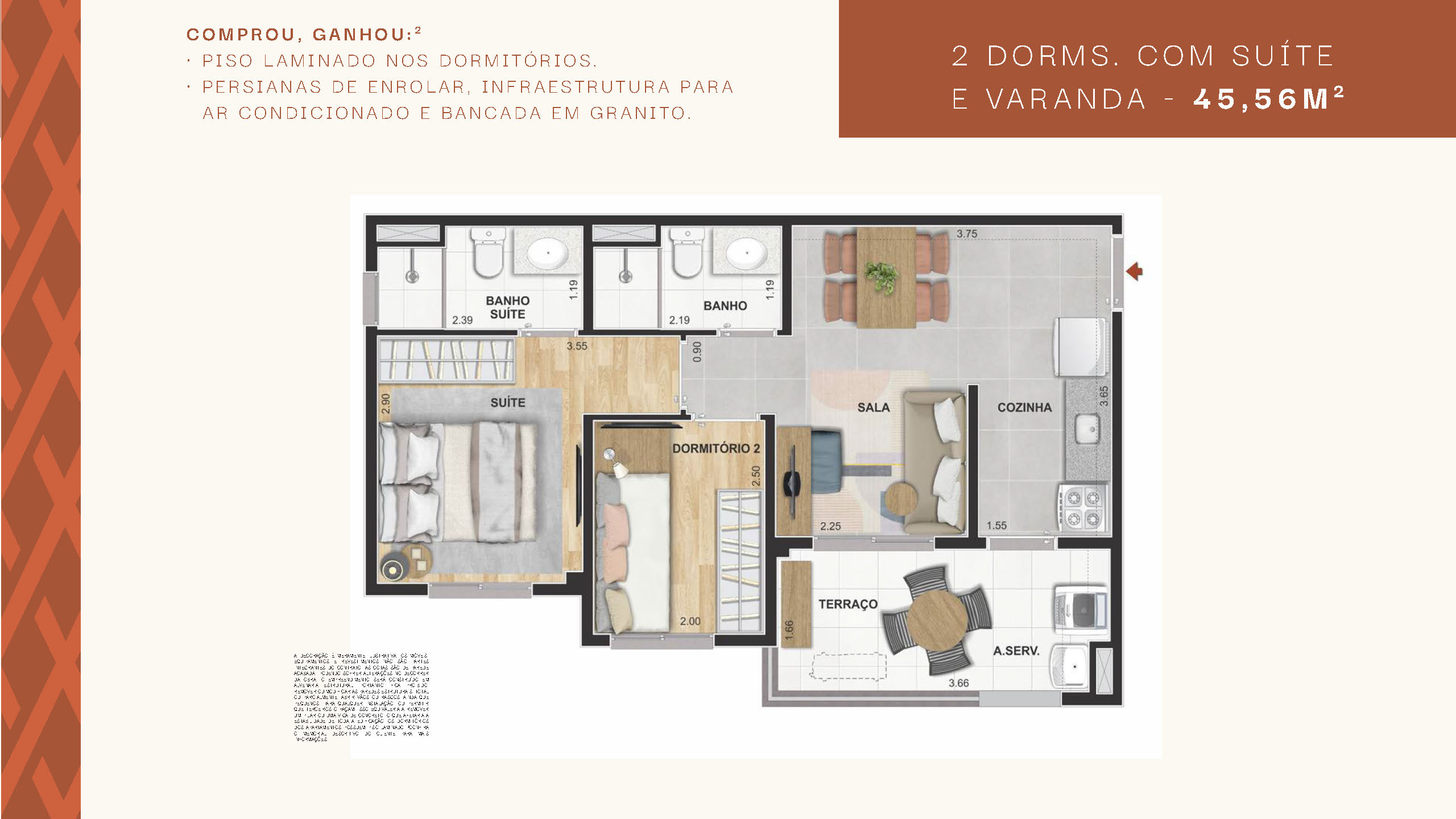 - 2 Dormitórios com Suíte (45m²): A planta mais completa, com suíte e terraço, ideal para máximo conforto.